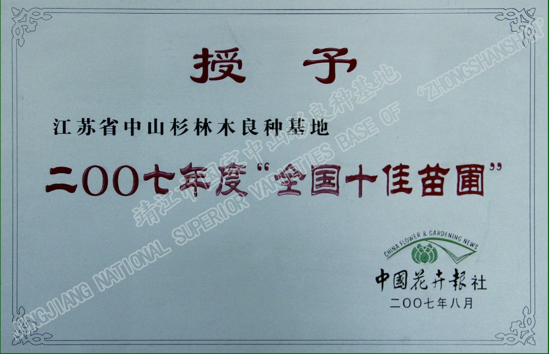 靖江市中山杉林木良種有限公司單位現(xiàn)有職工120人,其中中高級技術(shù)人員26人,初級技術(shù)人員45人,高級技工45多人,備有多功能灑水車、高空作業(yè)車、挖掘機(jī)、草坪噴播機(jī)等齊全的園林施工機(jī)械,年承接綠化工程100萬平方米以上。公司自成立以來,參與了眾多省內(nèi)外綠化重點(diǎn)工程的建設(shè),先后完成江陰長江公路大橋、潤揚(yáng)大橋、南京三橋、蘇州吳中大道、揚(yáng)州西北線繞城、無錫沿江高速、無錫342省道、滬寧高速、泰高路、寧通高......